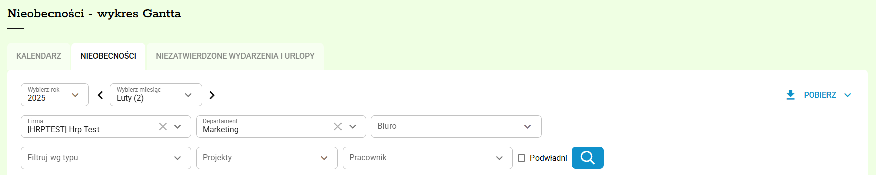 2. W zakładce Nieobecności możesz wybrać filtry: Firma, Departament, Biuro, Typ nieobecności, Projekt lub Pracownik.