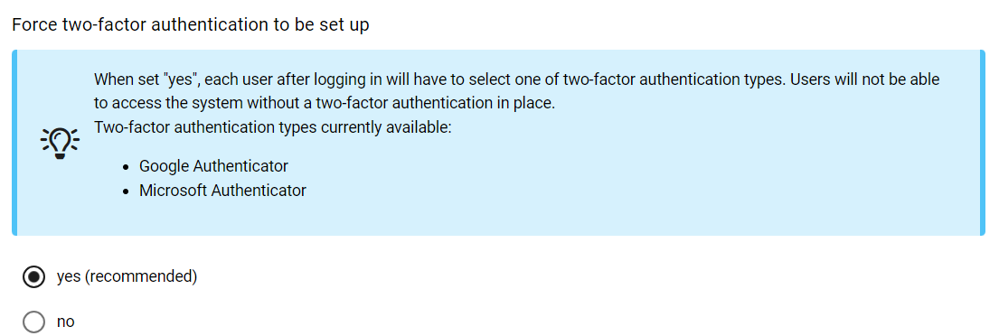By selecting YES, each user will be required to select one of the two-factor authentication types upon login. Users will not be able to access the system without two-factor authentication.