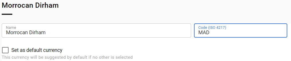 5. Complete the three-letter currency code adopted by the ISO (4217) and tick the box below if the currency added is to be the default.
