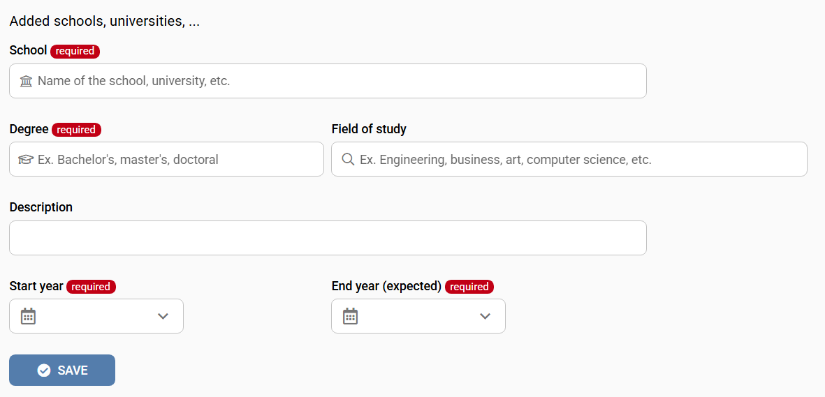 3. Complete the information on your education: name of school, degree, field of study, description, start and end year.