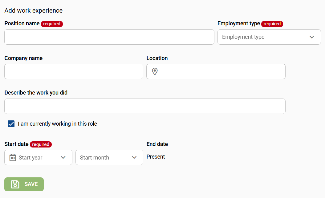 3. Complete the experience information: job title, form of employment, company name, location, job description, start and end dates.