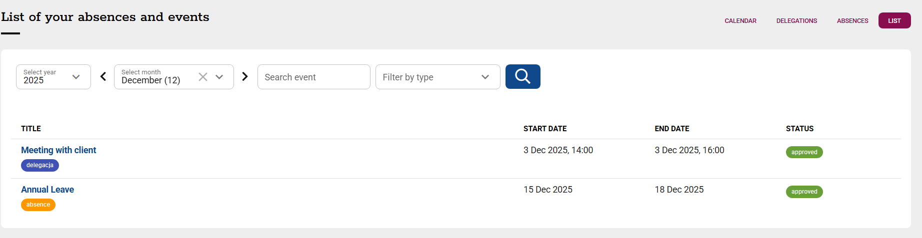 -LIST - of all events with details and statuses,