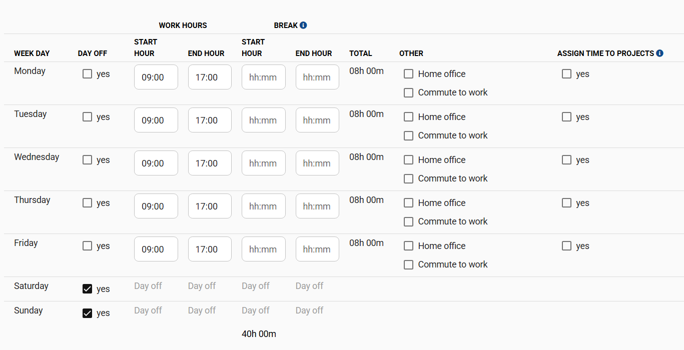 A monthly timesheet is created based on the weekly work schedule. The hours set in the weekly schedule should match your working hours and the details specified in your contract.