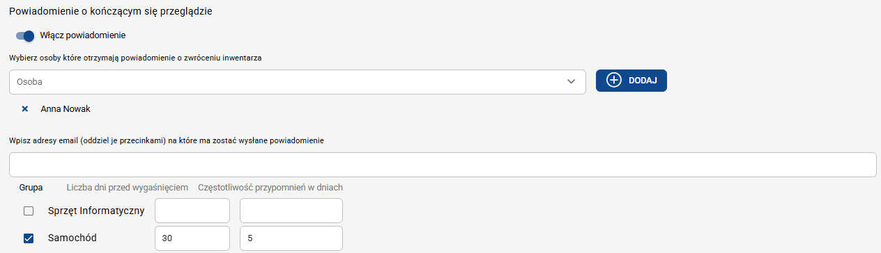 Włącz powiadomienia, wybierz osoby z listy lub dodaj zewnętrzne adresy e-mail, do których powiadomienie będzie wysyłane, oznacz grupę produktów, wyznacz ile dni przed wygaśnięciem i z jaką częstotliwością przypomnienie ma być wysyłane.
