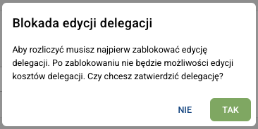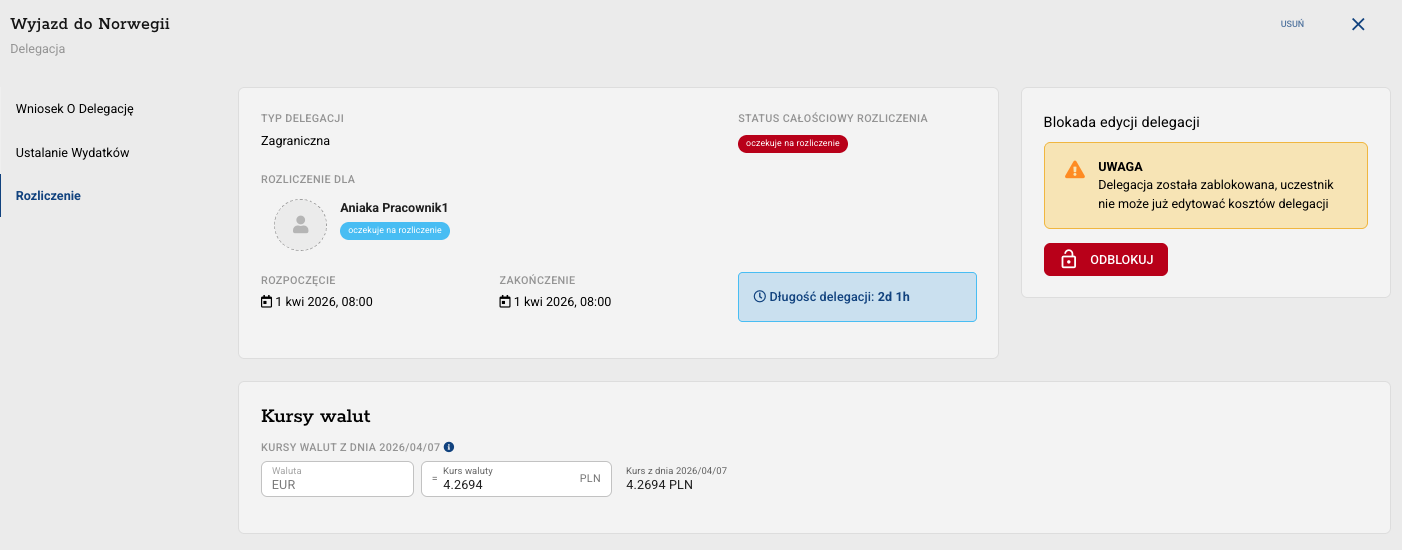 Przesłane przez uczestników ustalenia wydatków i poniesionych kosztów, wpływają do zakładki ROZLICZONE. Po otwarciu przesłanej do rozliczenia delegacji system zasugeruje blokadę edycji delegacji, aby w czasie rozliczania uczestnik nie mógł wprowadzać zmian w Ustalaniu wydatków.