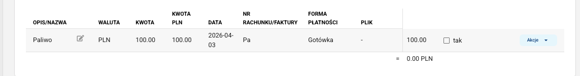- PODLEGA ROZLICZENIU - wydatek poniesiony przez pracownika i zaakceptowany do zwrotu. Płacony np. Prywatną kartą kredytową. Wlicza się w podsumowanie do zwrotu.