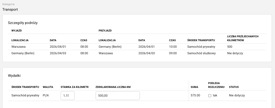 - Stawka za kilometr jest pobierana automatycznie z ustawień delegacji.