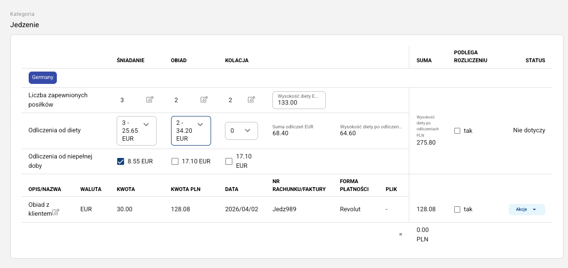 - Umożliwia dokonanie odliczeń od diety w przypadku, gdy pracownik miał zapewnione posiłki. Wysokość diety jest automatycznie wyliczana na podstawie deklaracji etapów delegacji.