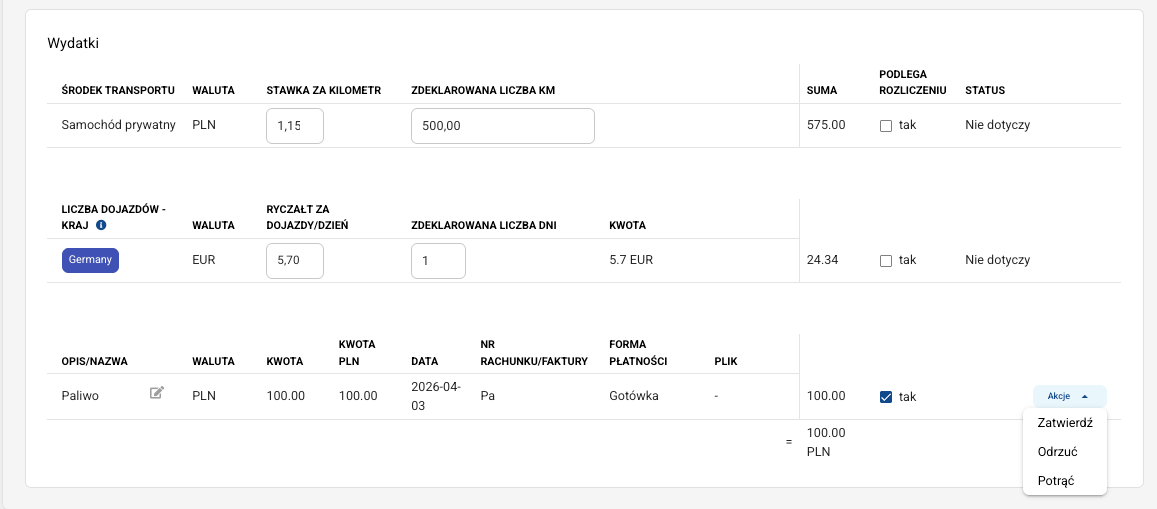 - Wydatki można Zatwierdzić, Odrzucić, lub Potrącić. Jeśli status jest już ustalony, oznacza to, że wydatki te zostały przeprocesowane już np. przez przełożonego (lub wg. procesu zatwierdzenia wydatków)