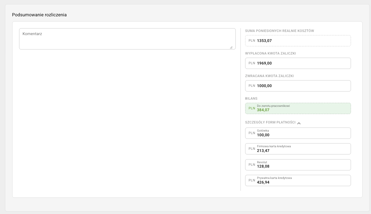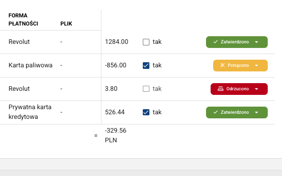 - NIE PODLEGA ROZLICZENIU - wydatek zaakceptowany, poniesiony przez pracownika zasadnie ale nie podlegający zwrotowi ze względu na płatność np. Firmową kartą kredytowa / Firmową kartą Revolut. Nie wilcza się w podsumowanie do zwrotu.