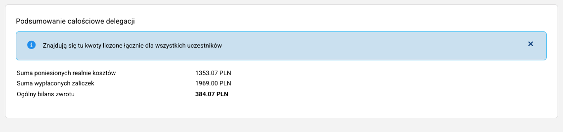 WAŻNE: Wszystkie wydatki muszą mieć określone STATUSY, aby można było rozliczyć delegację dla wybranego uczestnika. - Podsumowanie całościowe delegacji zawiera podsumowanie rozliczeń dla wszystkich uczestników delegacji.