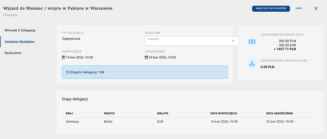 Dla delegacji zagranicznych, jeśli uczestnik po drodze przebywał jeszcze na terenie Polski w celach biznesowych, system automatycznie wyliczy przysługującą dietę zarówno krajową jak i zagraniczną.