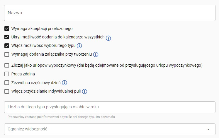 4. Uzupełnij dane dotyczące nowego typu nieobecności: nazwę; zaznacz okna: jeżeli wymagana jest akceptacja przełożonego, jeżeli dzień będzie zliczany jako dzień urlopowy, zaznacz czy możliwa jest praca zdalna, wskaż liczbę dni przysługujących w roku i dostosuj inne opcje.
