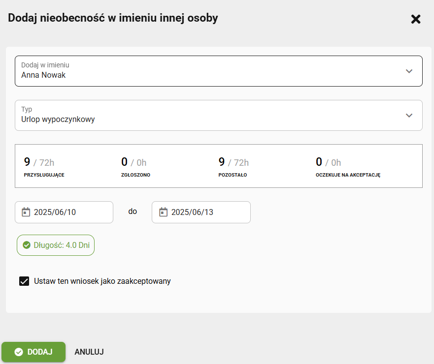 3. Wybierz użytkownika, rodzaj nieobecności i daty.