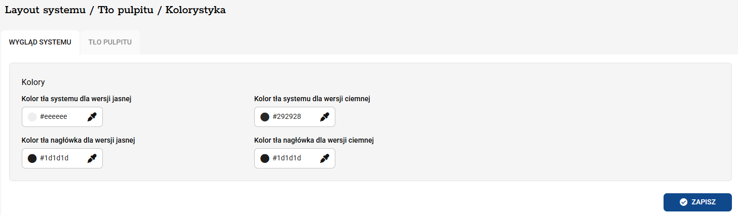 6. Zapisanie zmian Po wybraniu odpowiednich barw, zatwierdź zmiany przyciskiem ZAPISZ na dole strony, aby odświeżyć wygląd interfejsu.