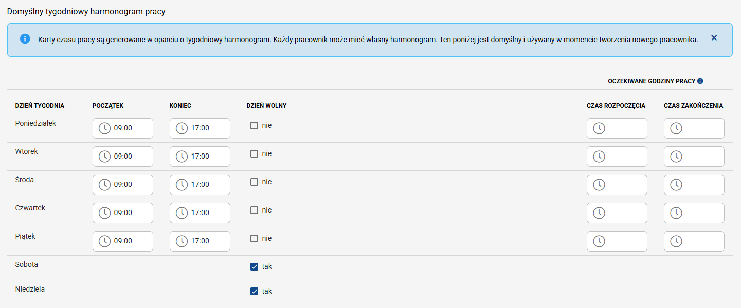 3. W bloku Domyślny tygodniowy harmonogram pracy możesz ustawić grafik, który będzie generowany dla wszystkich nowych użytkowników systemu.