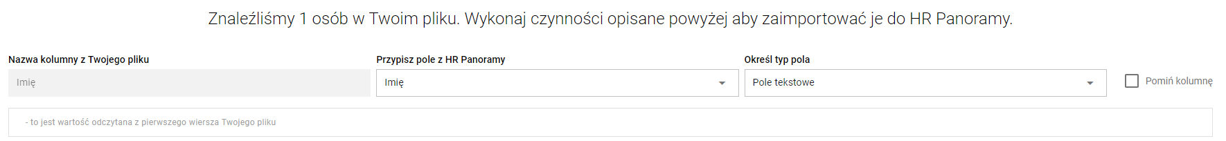 a) Przypisz kolumnom (z przesłanego pliku Excel) pole z HR Panoramy. Aby to zrobić wybierz z listy w kolumnie "Przypisz pole z HR Panoramy" pole odpowiadający kolumnie z pliku. System podpowie CI pole odpowiadające nazwie.