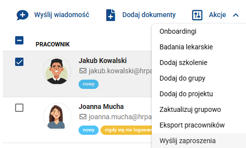 2. Zaznacz w okienku po lewej stronie pracownika lub pracowników, którym chcesz wysłać zaproszenia i kliknij AKCJE, a następnie wybierz WYŚLIJ ZAPROSZENIA.
