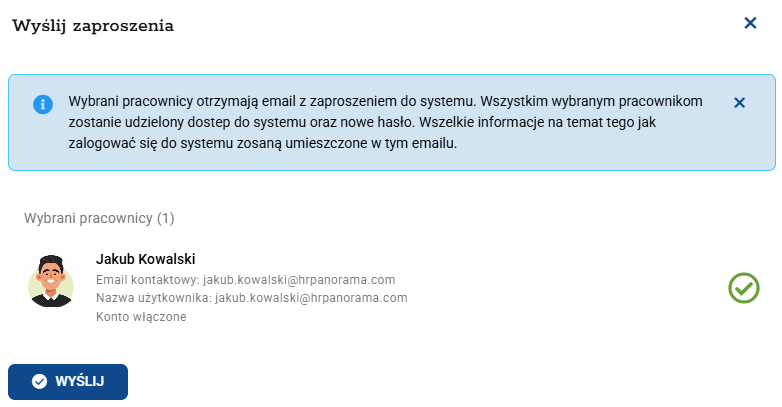 Wybrani pracownicy otrzymają email z zaproszeniem do systemu. Wszystkim wybranym pracownikom zostanie udzielony dostęp oraz nowe hasło.