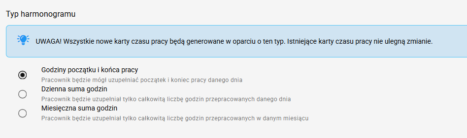 *** Wybrany harmonogram będzie obowiązywał od następnej dodanej Karty Czasu Pracy. Jeżeli chcesz nanieść zmiany na aktualną Kartę Czasu Pracy, musisz ją usunąć i dodać ponownie kartę na ten miesiąc. Uwaga: usunięcie Karty spowoduje usunięcie wszystkich danych uzupełnianych na tej karcie do tej pory (godziny pracy, przerwy, komentarze, przypisane projekty).