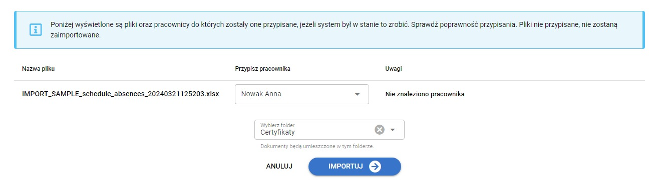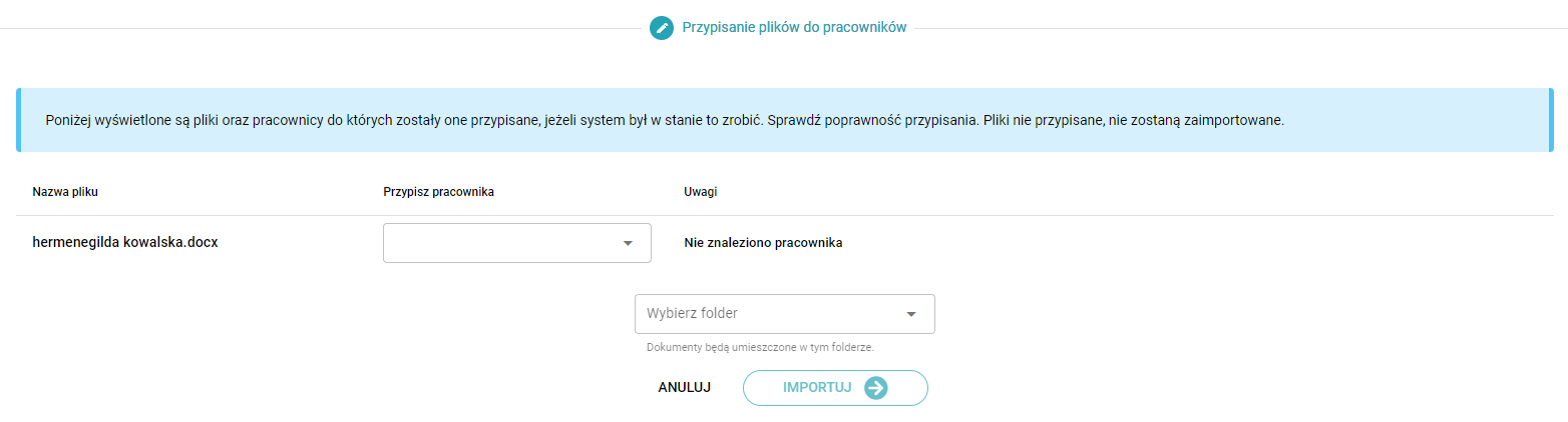6. Jeżeli system nie przypisał plików, wybierz z listy pracownika, do którego chcesz przypisać dokumenty; wybierz folder, w którym mają być zapisane i kliknij IMPORTUJ.